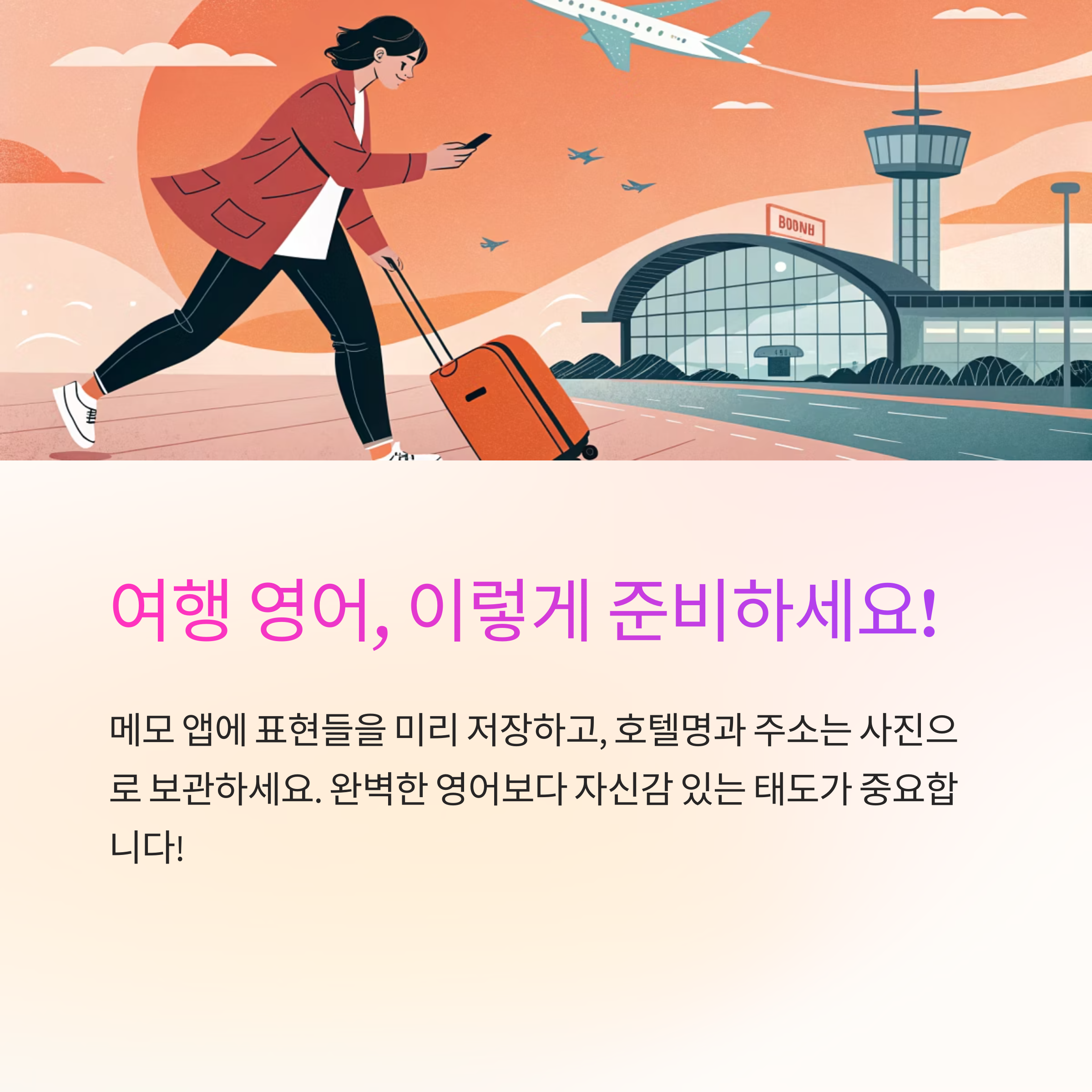 하지만 미리 자주 쓰이는 기본 영어 표현들을 익혀두면 훨씬 더 수월하고 자신 있게 여행을 시작할 수 있습니다.