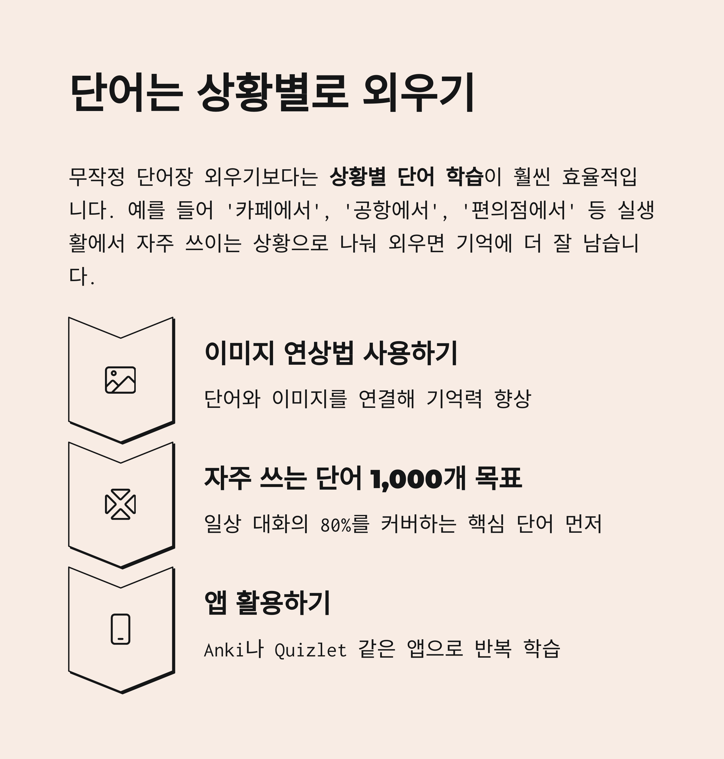 무작정 단어장 외우기보다는 **‘상황별 단어 학습’**이 훨씬 효율적입니다. 예를 들어 ‘카페에서’, ‘공항에서’, ‘편의점에서’ 등 실생활에서 자주 쓰이는 상황으로 나눠 외우면 기억에 더 잘 남습니다.