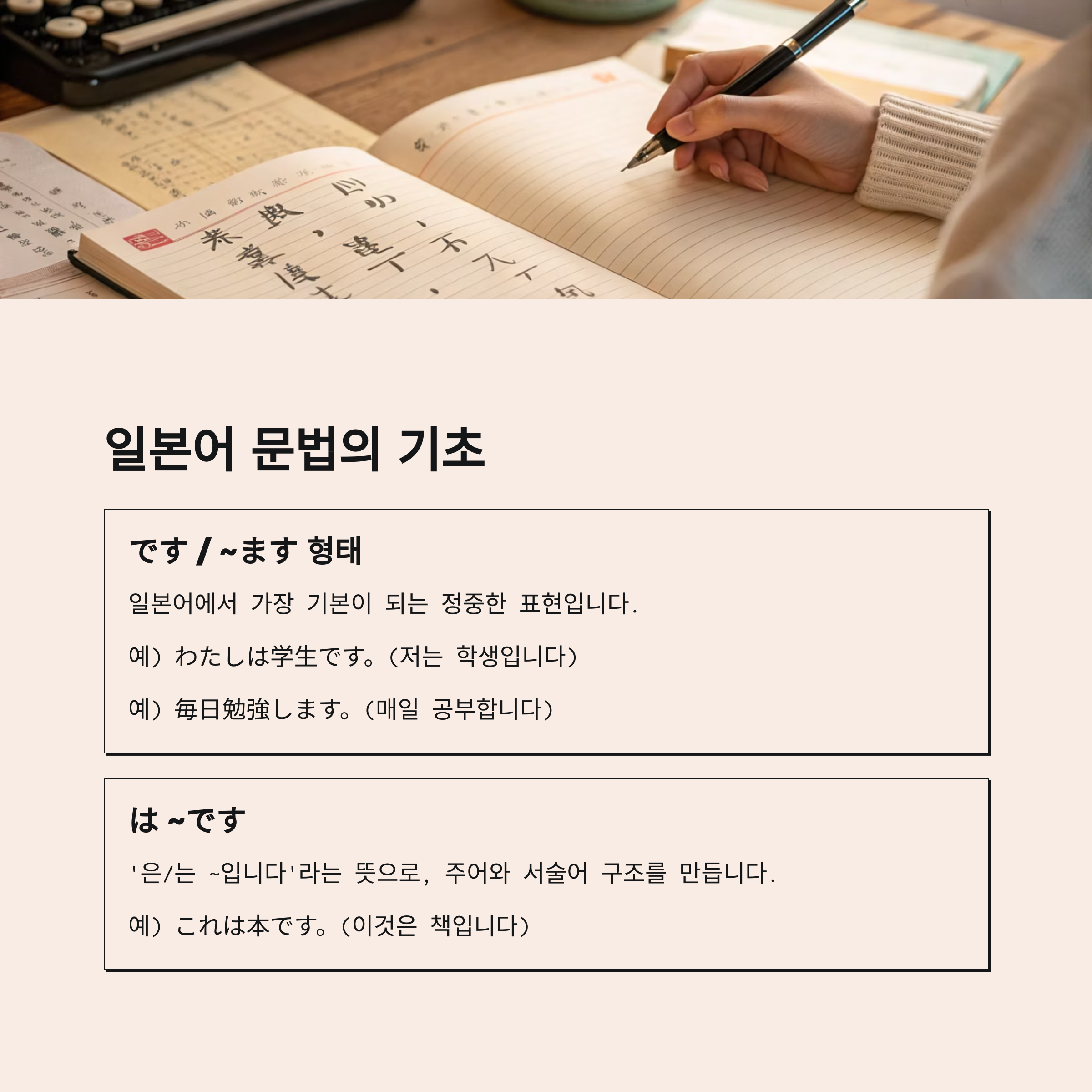 일본어를 처음 시작하는 분들에게 가장 어려운 부분 중 하나가 바로 일본어 문법입니다. 단어를 어느 정도 외웠더라도, 문형을 제대로 이해하지 못하면 문장을 만들거나 대화를 이어가기 어렵죠. 오늘은 일본어 문법 중에서도 초보자에게 꼭 필요한 10가지 필수 문형을 쉽게 정리해드리겠습니다.