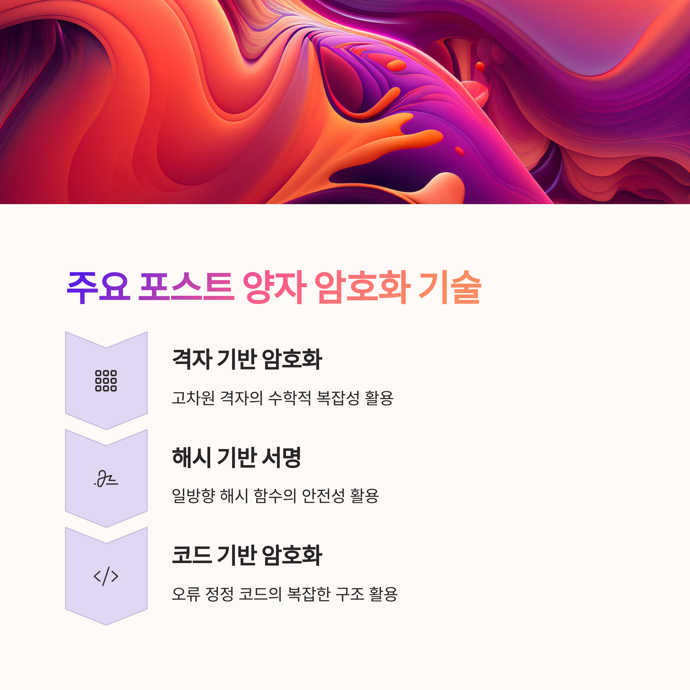 격자 기반 암호, 코드 기반 암호, 다변수 다항식 암호 등이 대표적인 포스트 양자 암호입니다. 이들은 수학적 복잡성을 기반으로 해 양자 컴퓨터에도 견딜 수 있습니다.