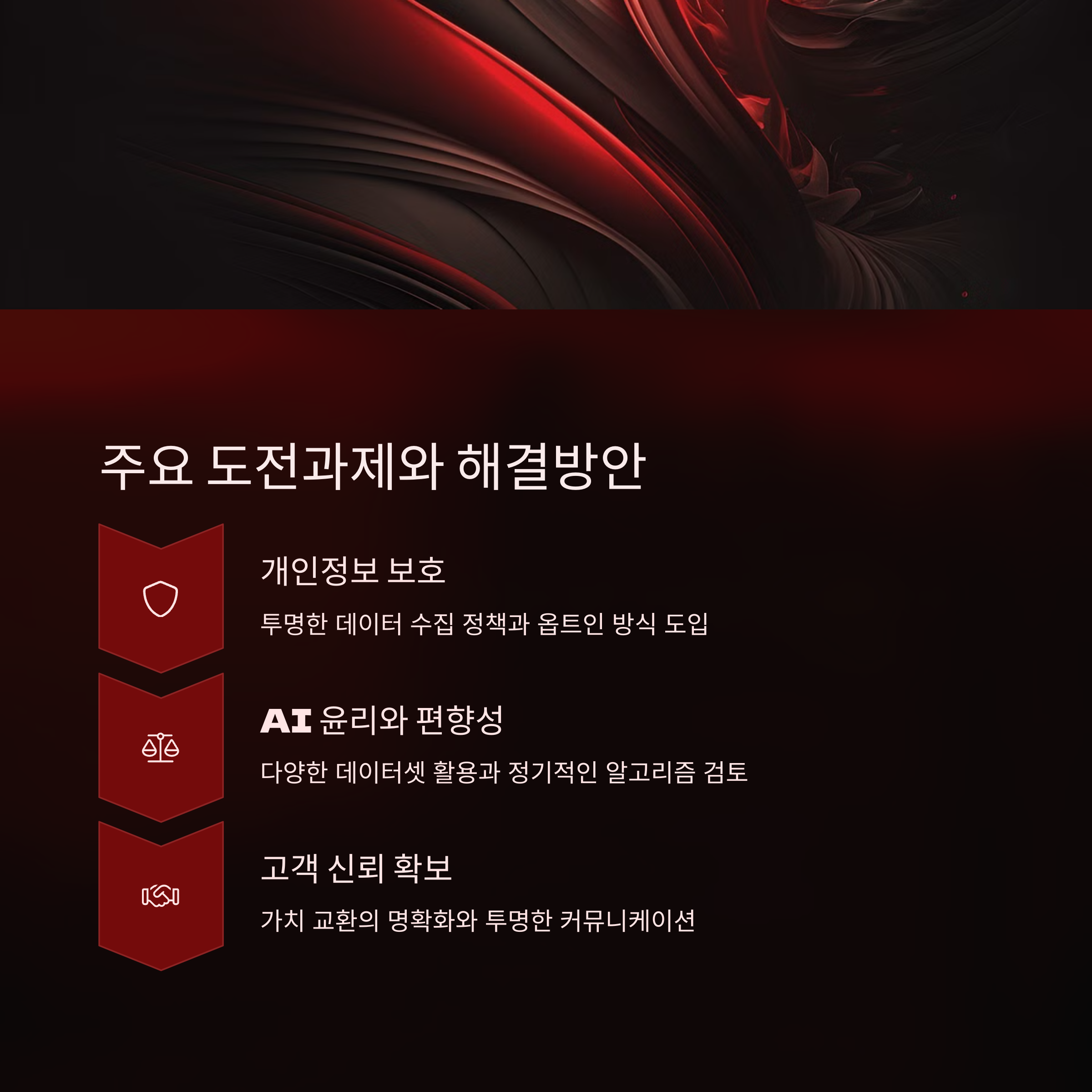 AI가 수많은 데이터를 수집하고 분석해 맞춤형 서비스를 제공하는 만큼, 고객의 정보가 어떻게 활용되는지에 대한 투명성과 신뢰 구축이 필수적이다.
