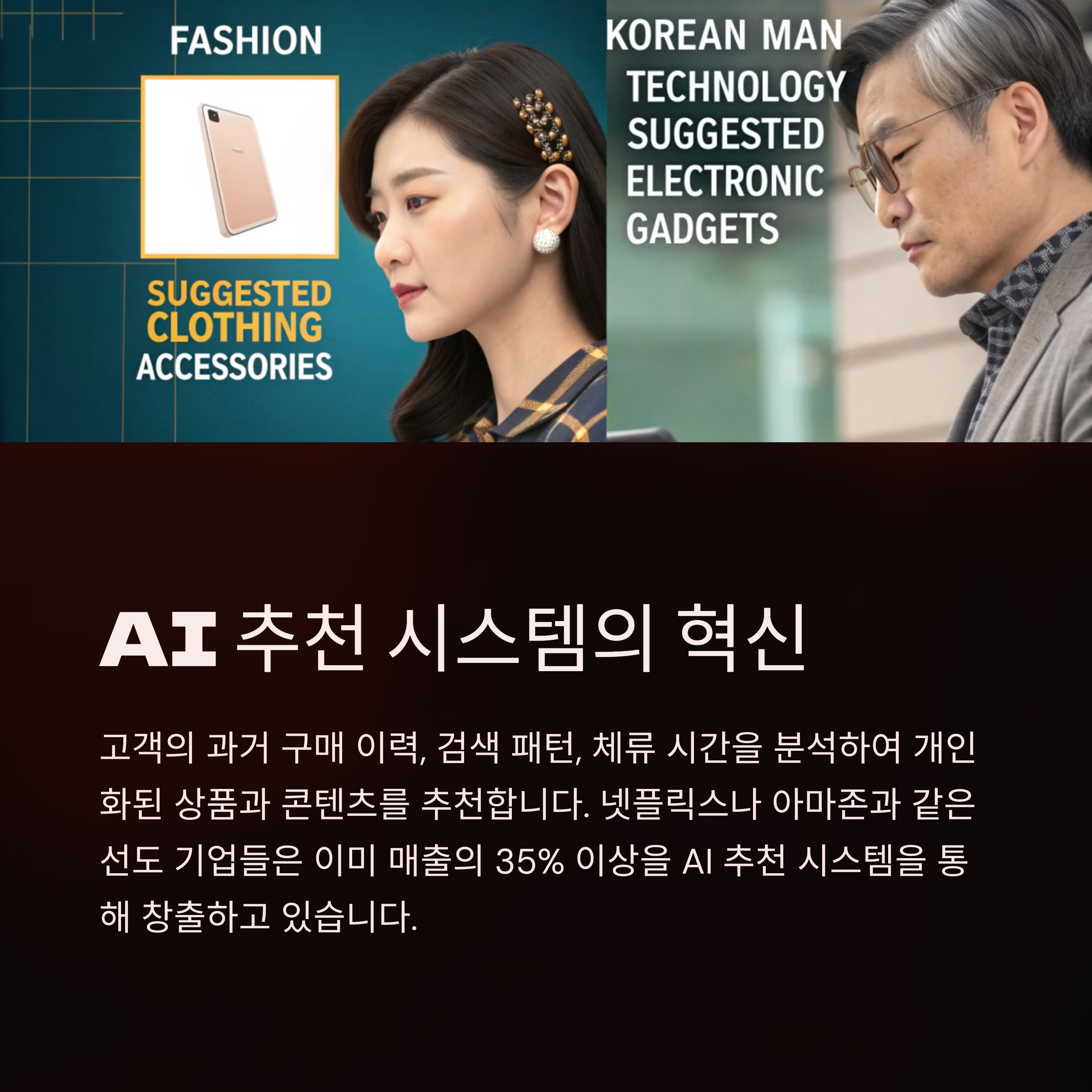 AI는 고객의 검색 이력, 클릭 패턴, 소비한 콘텐츠 유형 등을 분석해 각 고객에게 가장 적합한 콘텐츠를 자동으로 추천하거나 생성할 수 있게 한다.